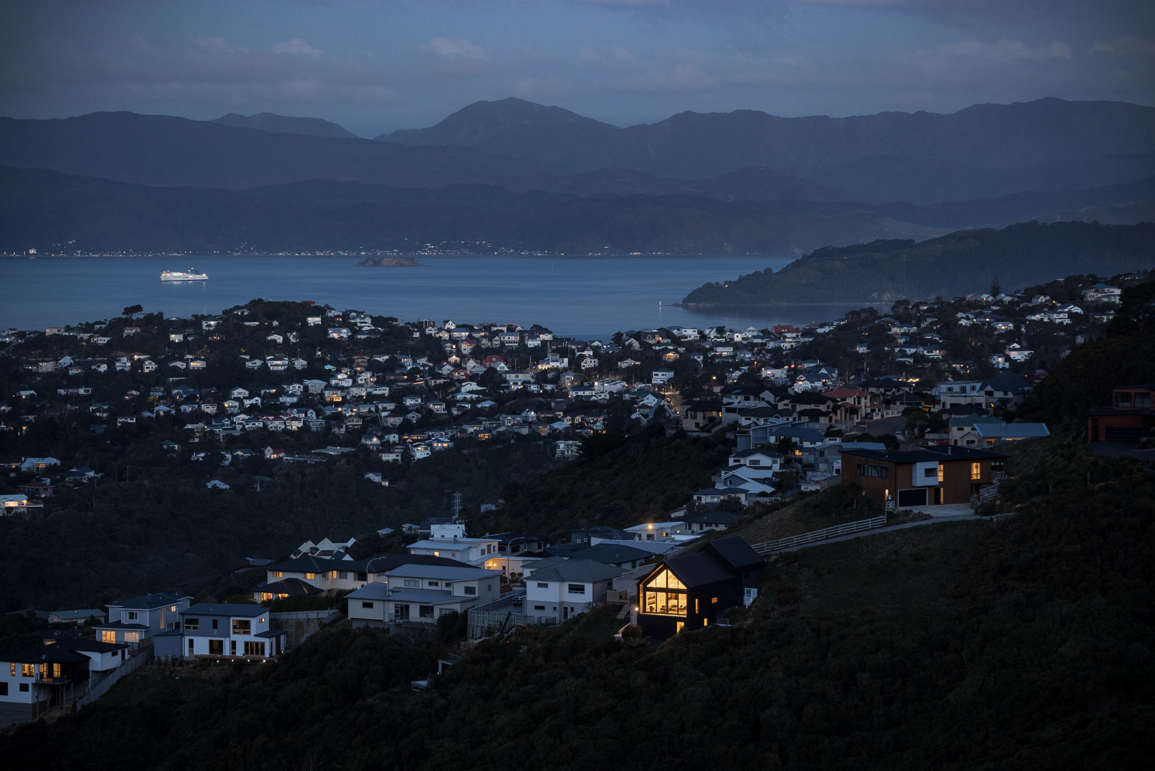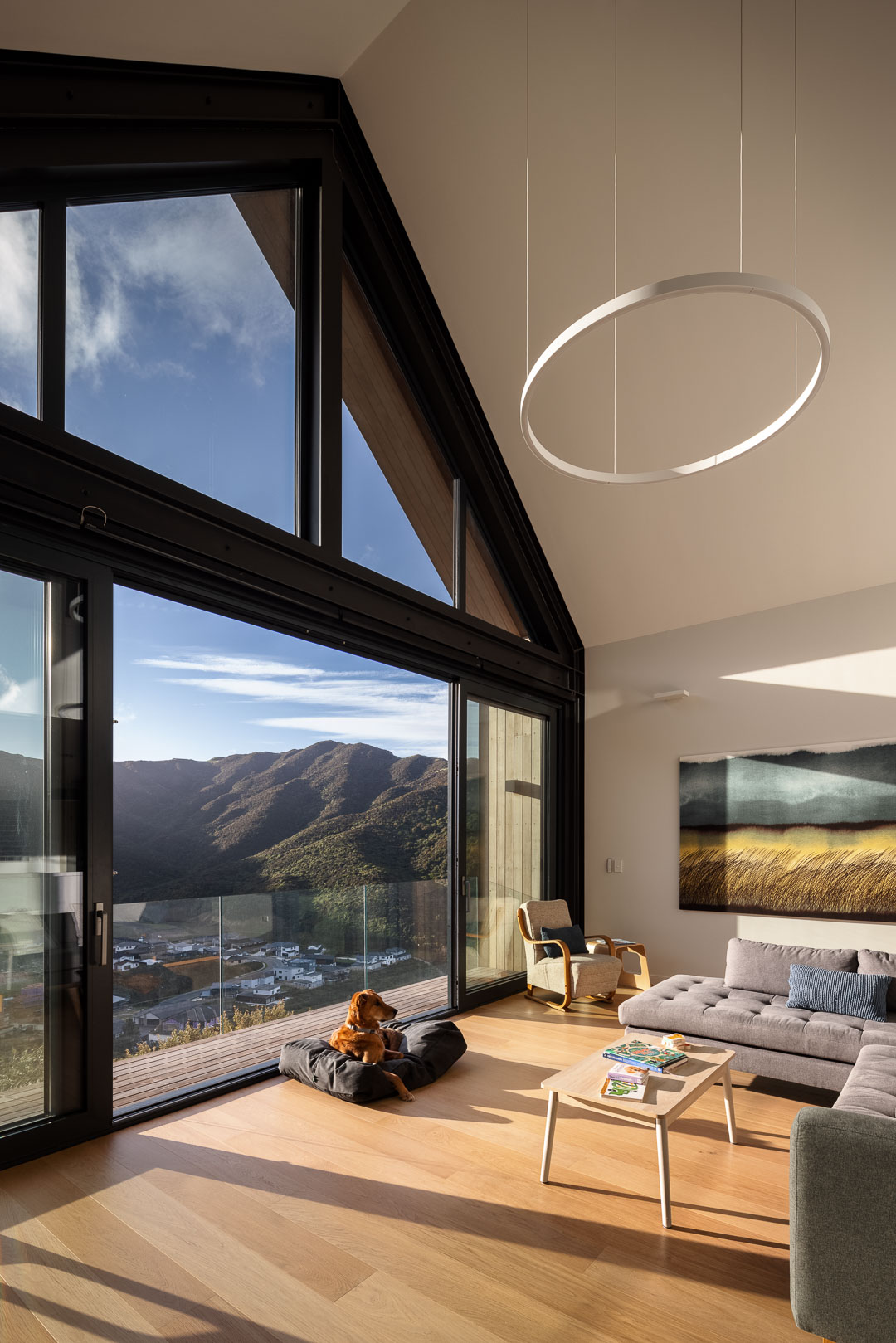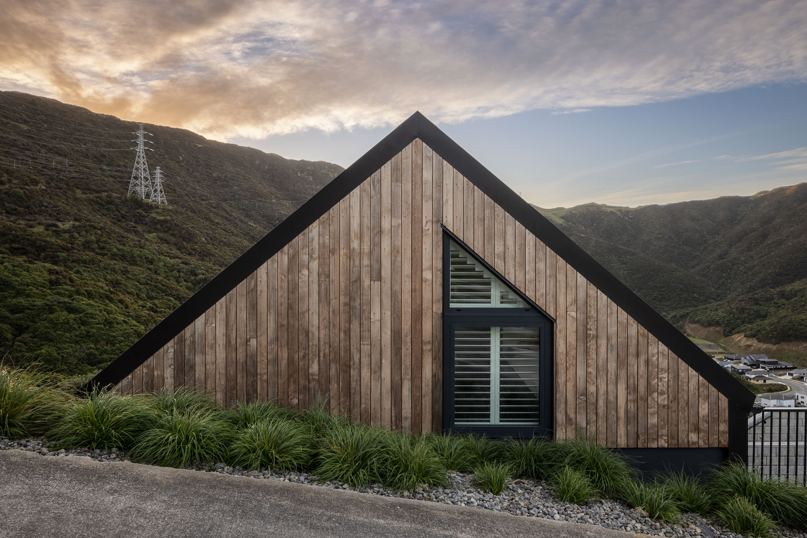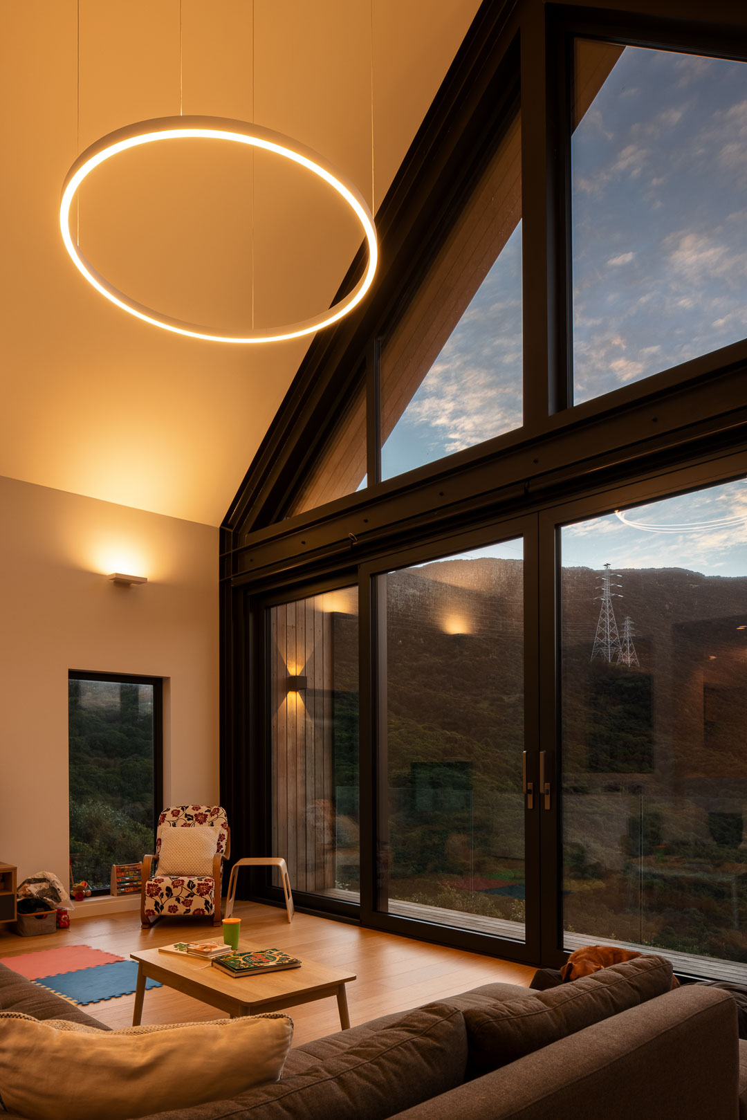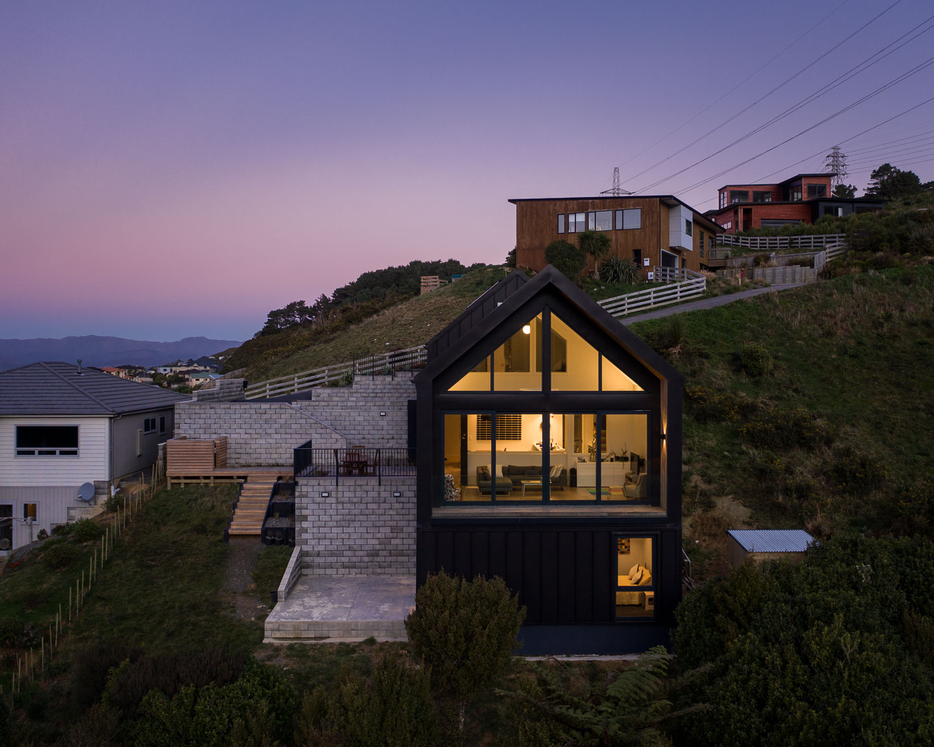 The gable provides the protective envelope in which the space folds and opens up. The exterior is a very simple form projecting from the sloping hill site facing the regenerating bush to the West. The interior is a more complex series of intersecting volumes that inhabit the gable fully, providing a home for a family of 4 and their dog.