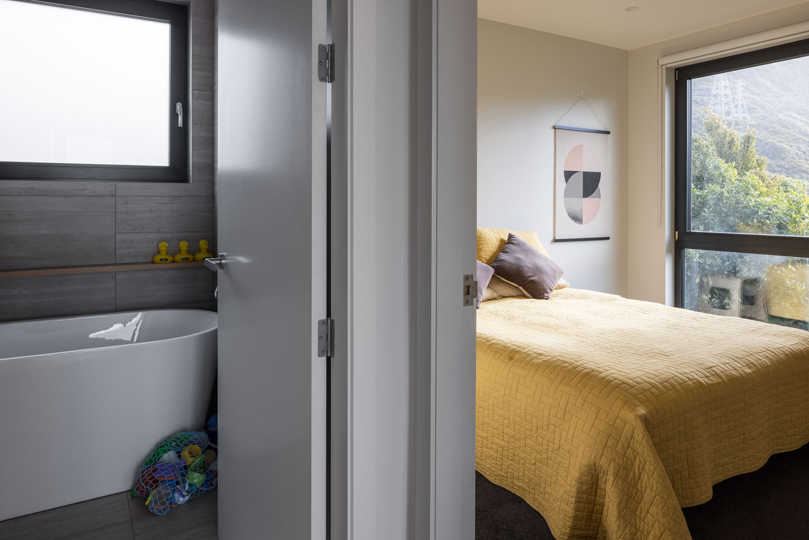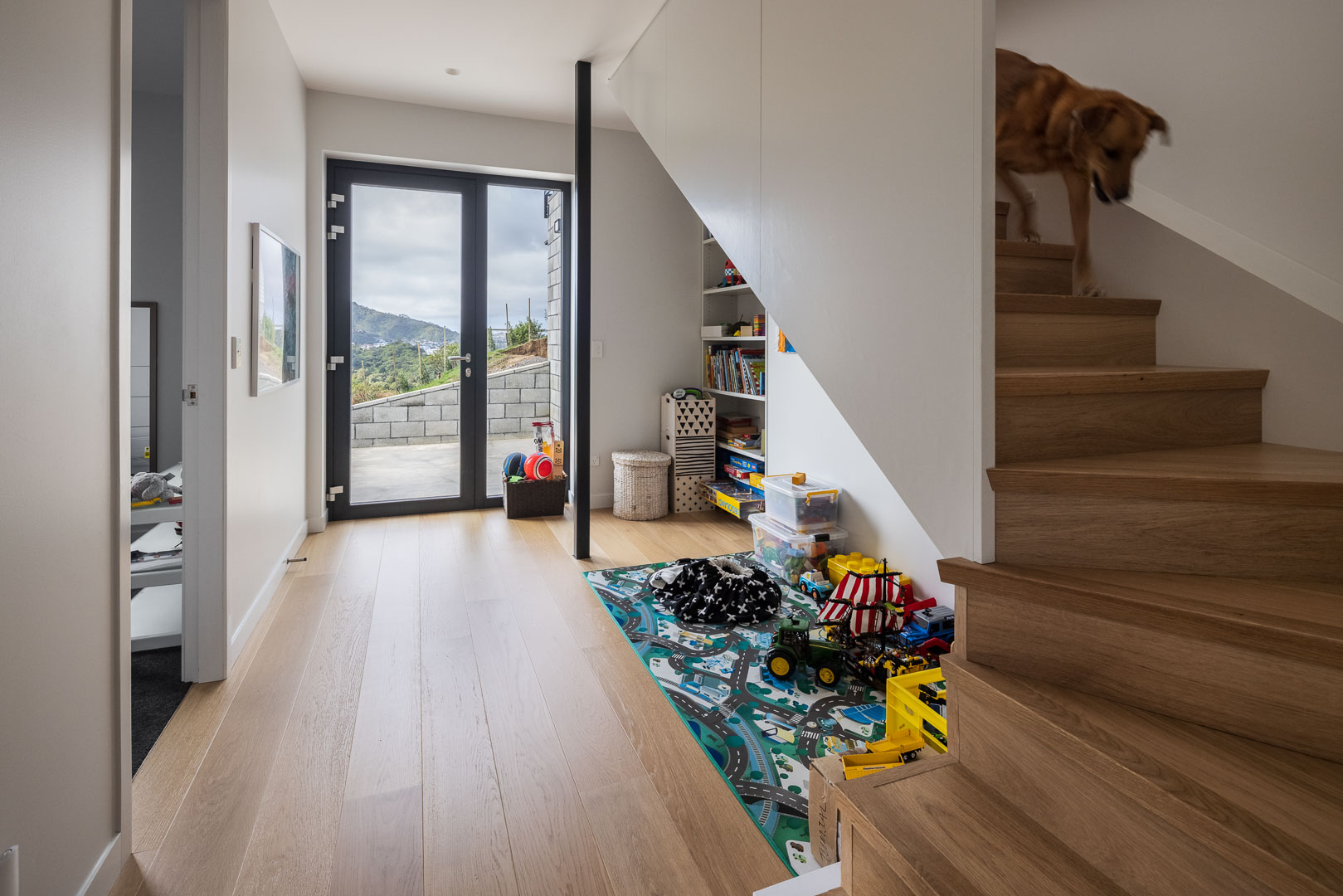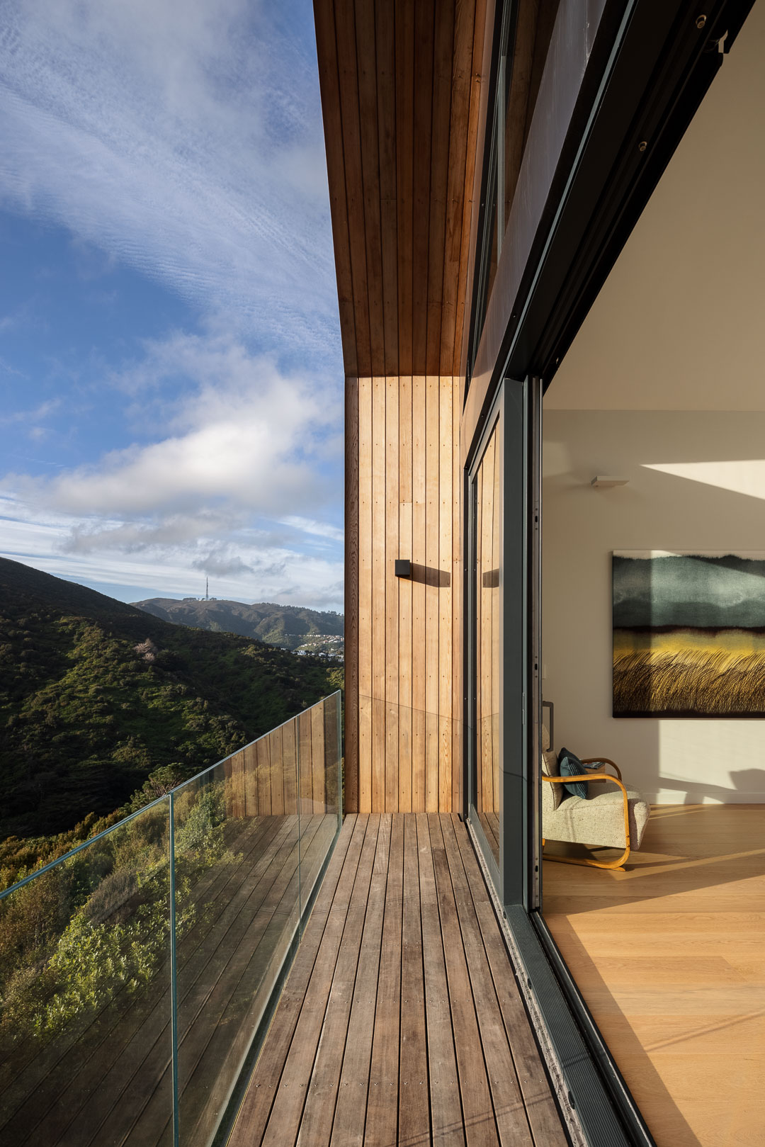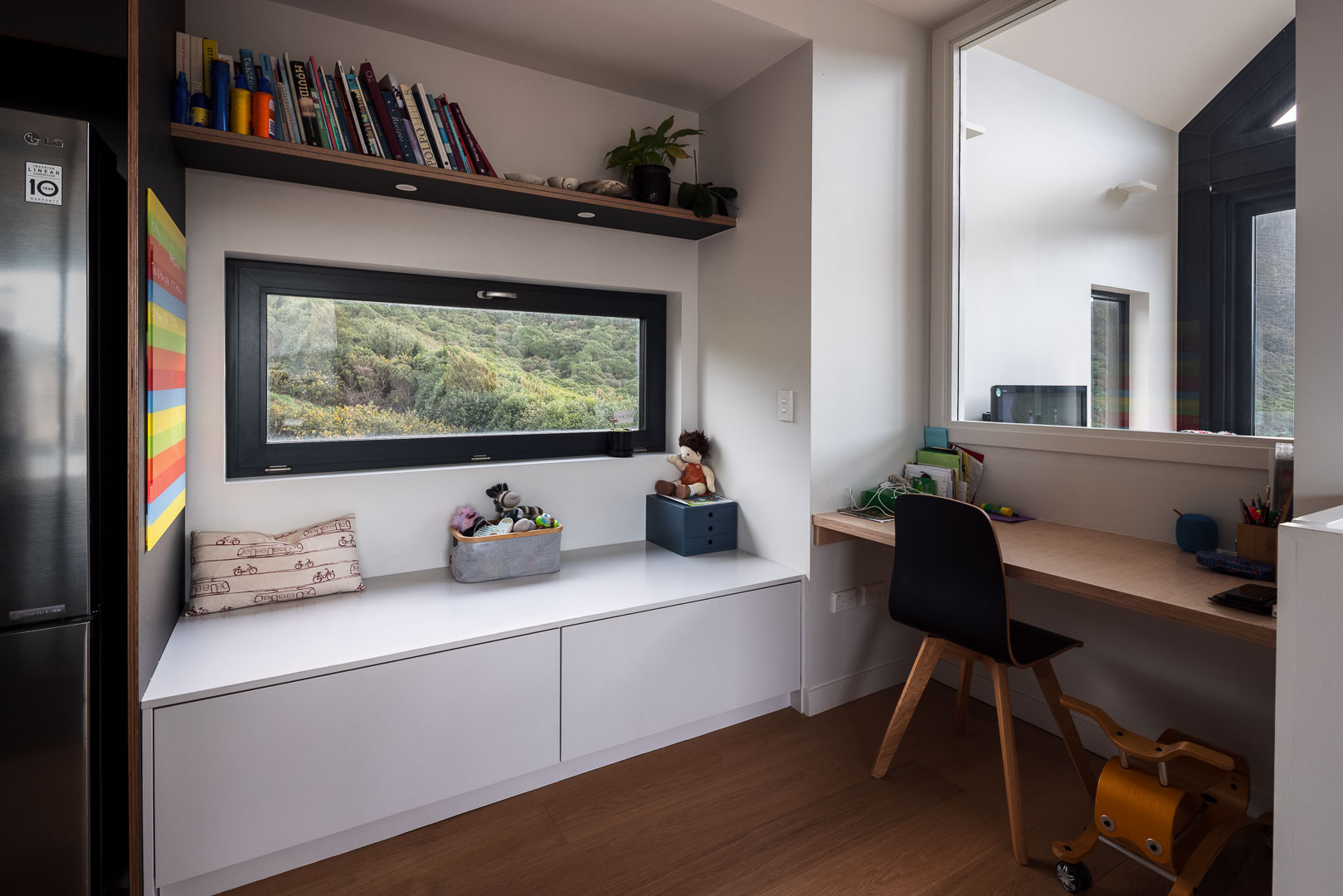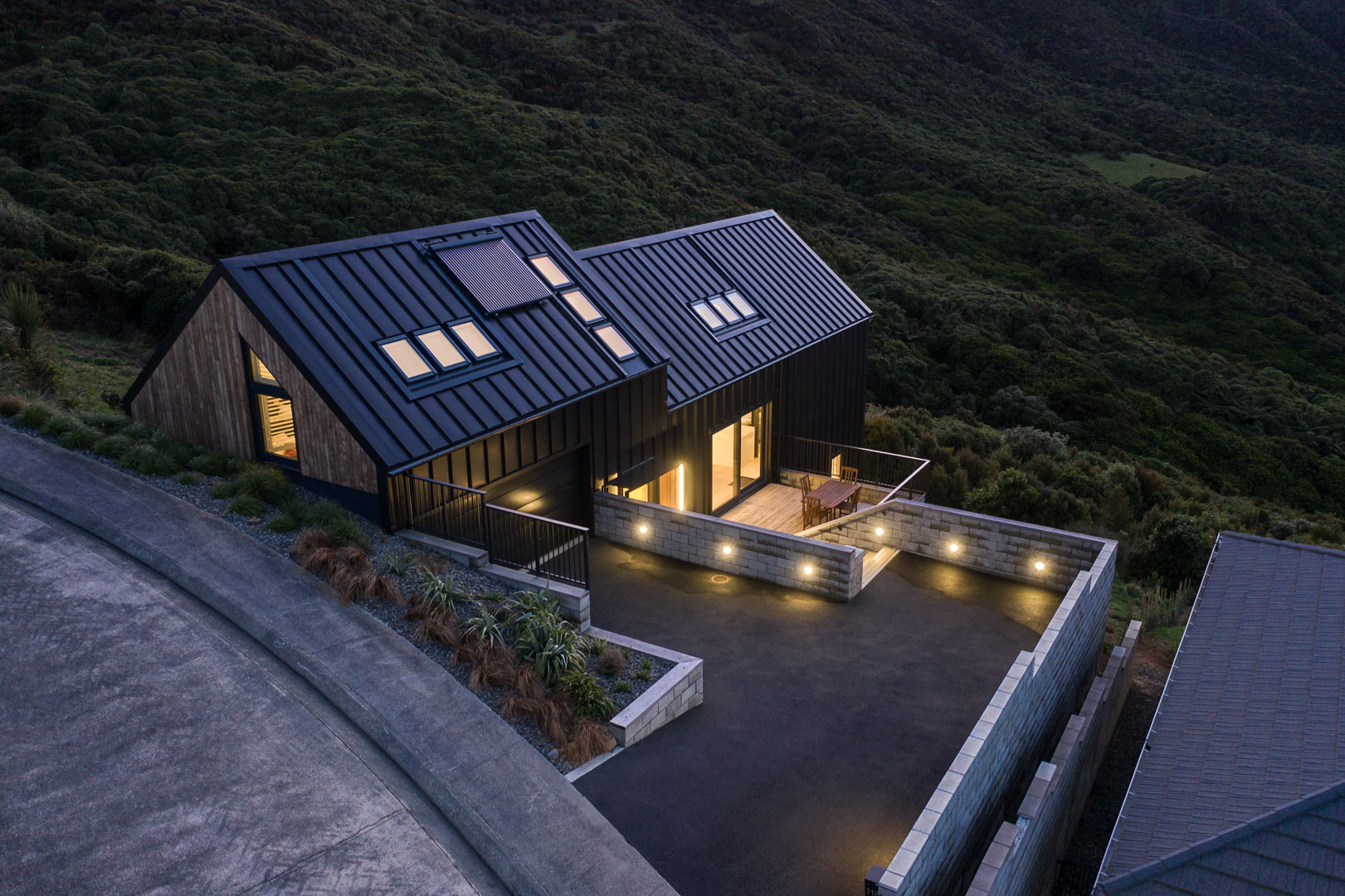 The gable provides the protective envelope in which the space folds and opens up. The exterior is a very simple form projecting from the sloping hill site facing the regenerating bush to the West. The interior is a more complex series of intersecting volumes that inhabit the gable fully, providing a home for a family of 4 and their dog.