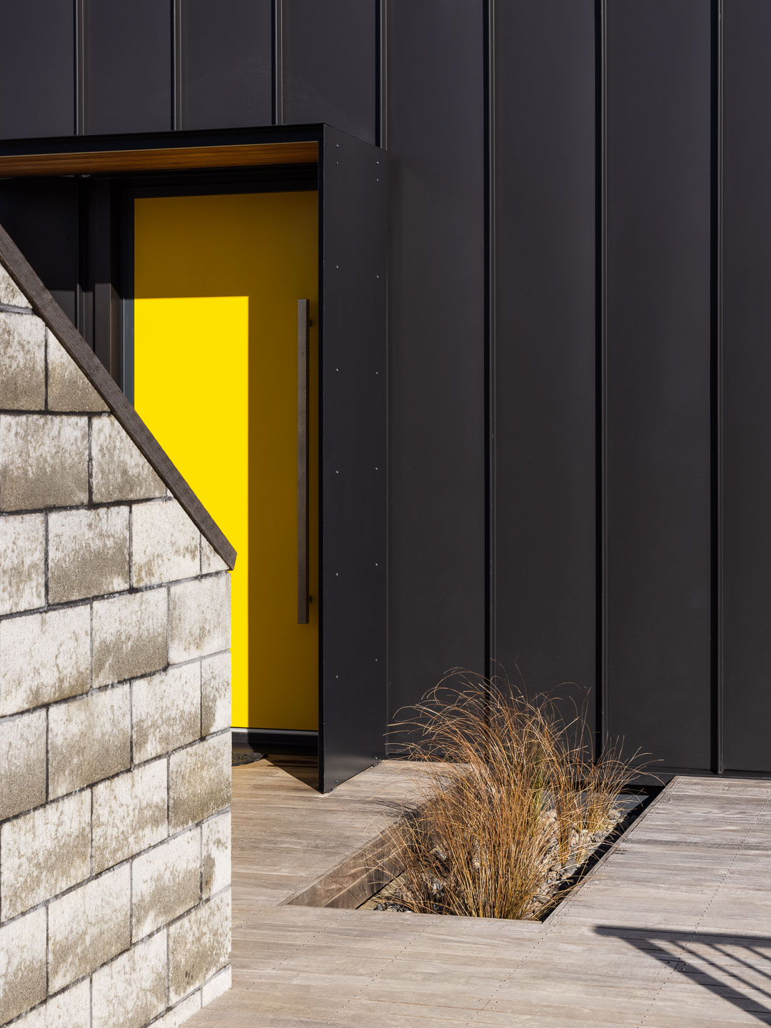 The house sits low on the street edge, with the garage hidden below. Continuous dark metal cladding further nestles the house into the green of the bush surrounds. Although a large family home, it is only the help of the drone that allows the scale of the house to be read against the hill. The outside is nearly as quiet as the inside.