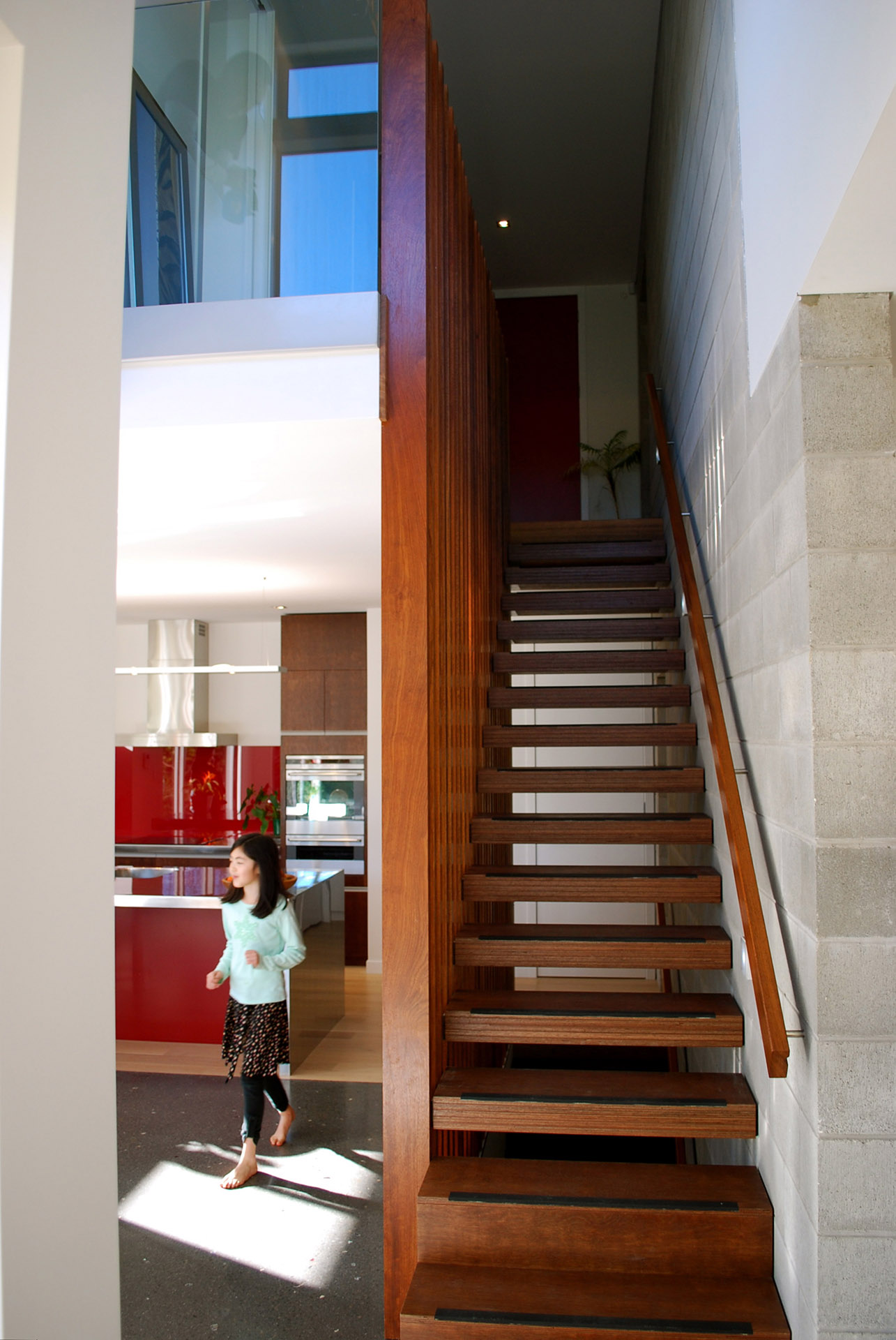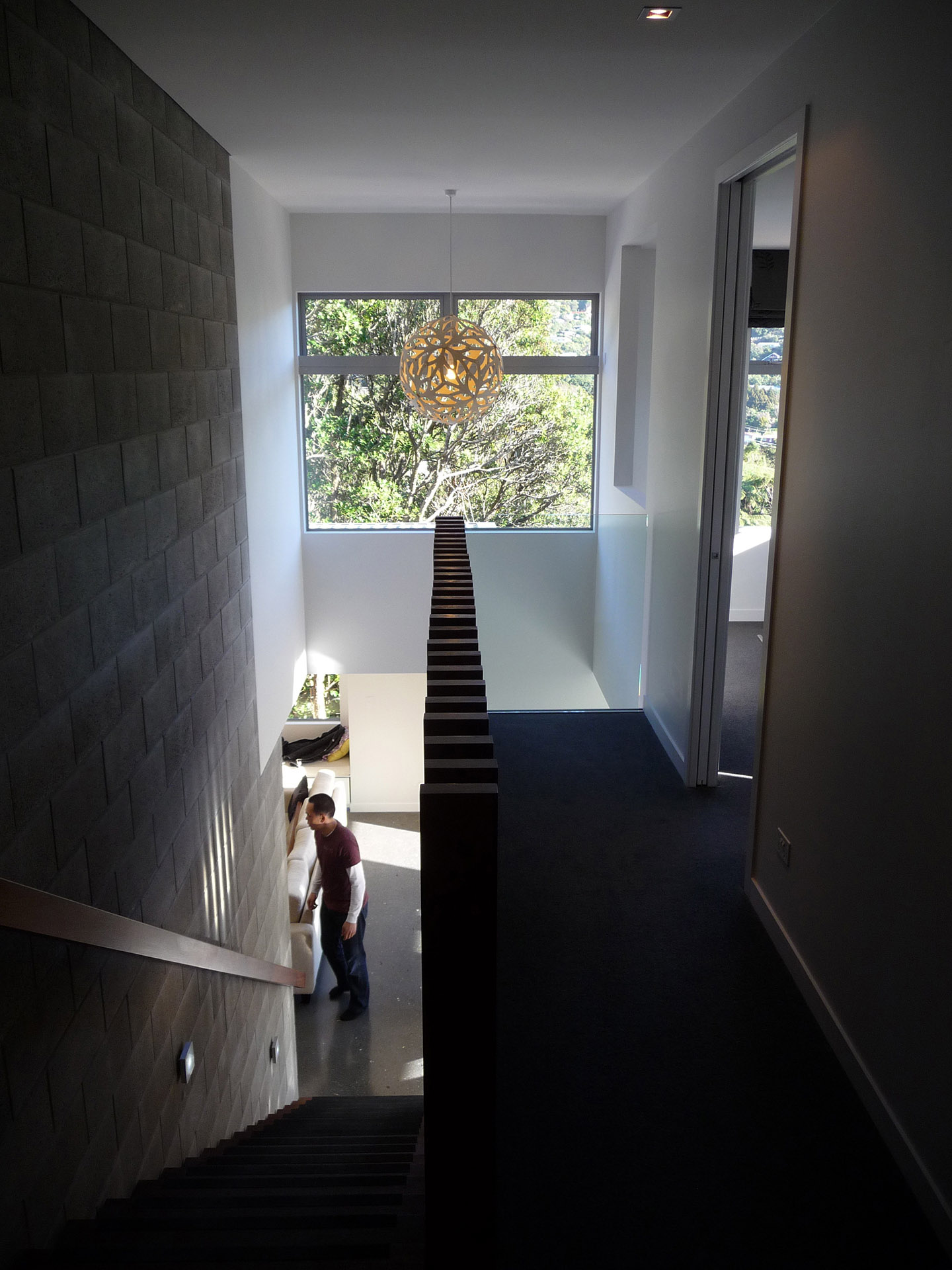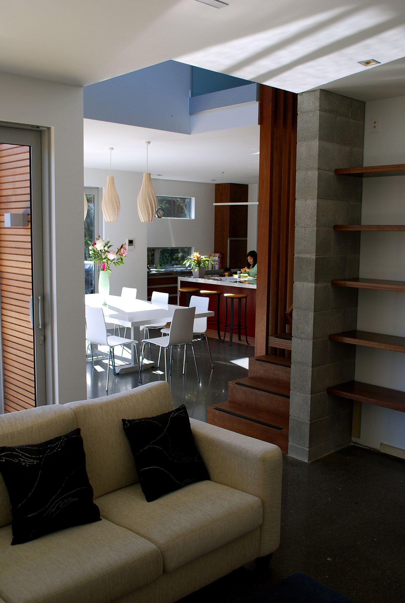 The house sits close to the street edge, and parking needed to be provided on site. The house is closed to the street, with a concrete wall and a door facing onto the car-pad. As you cross the threshold and descend you are aware of how private the house is despite its proximity to the road. The added benefit of the mass is the reduction in noise to the interior.