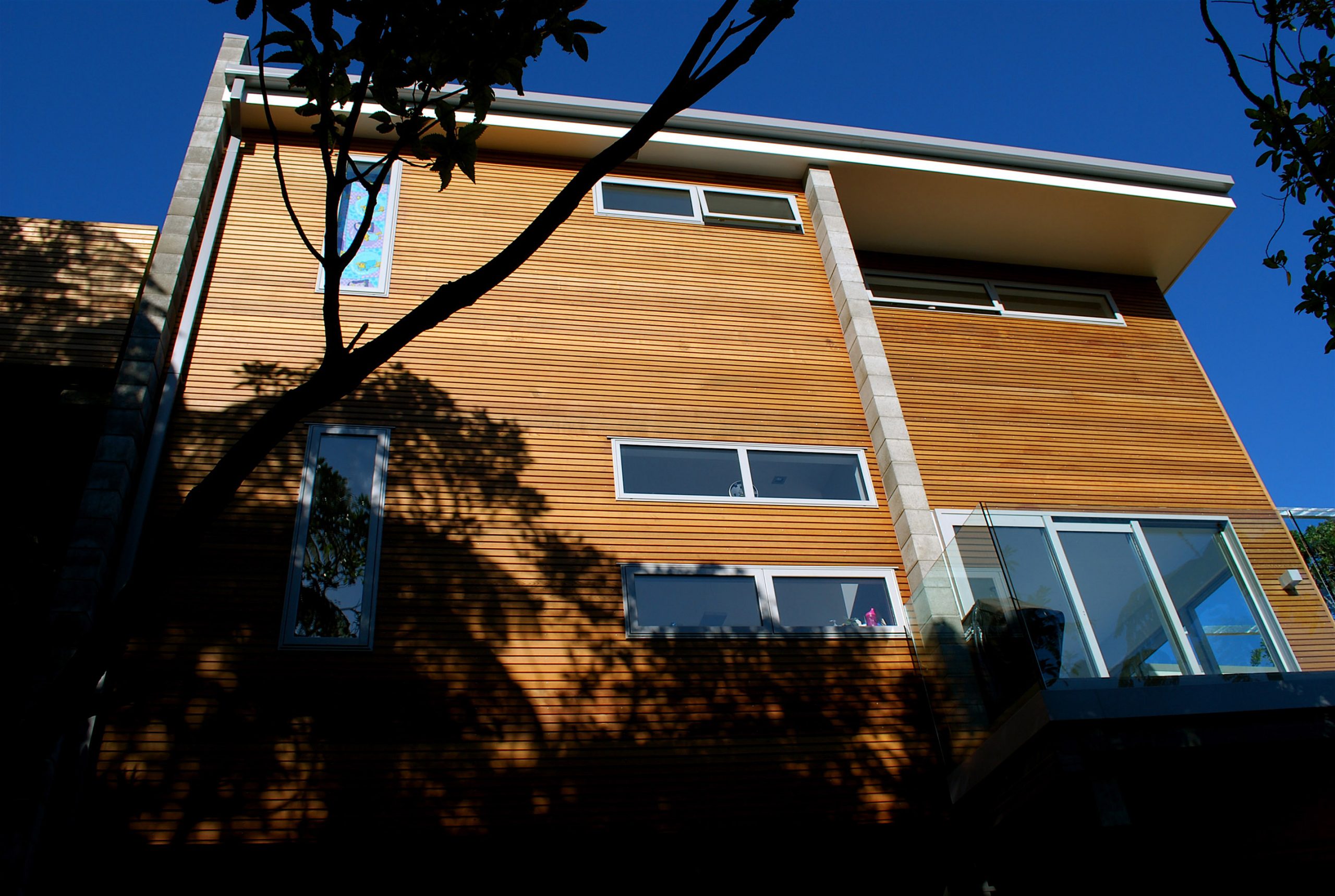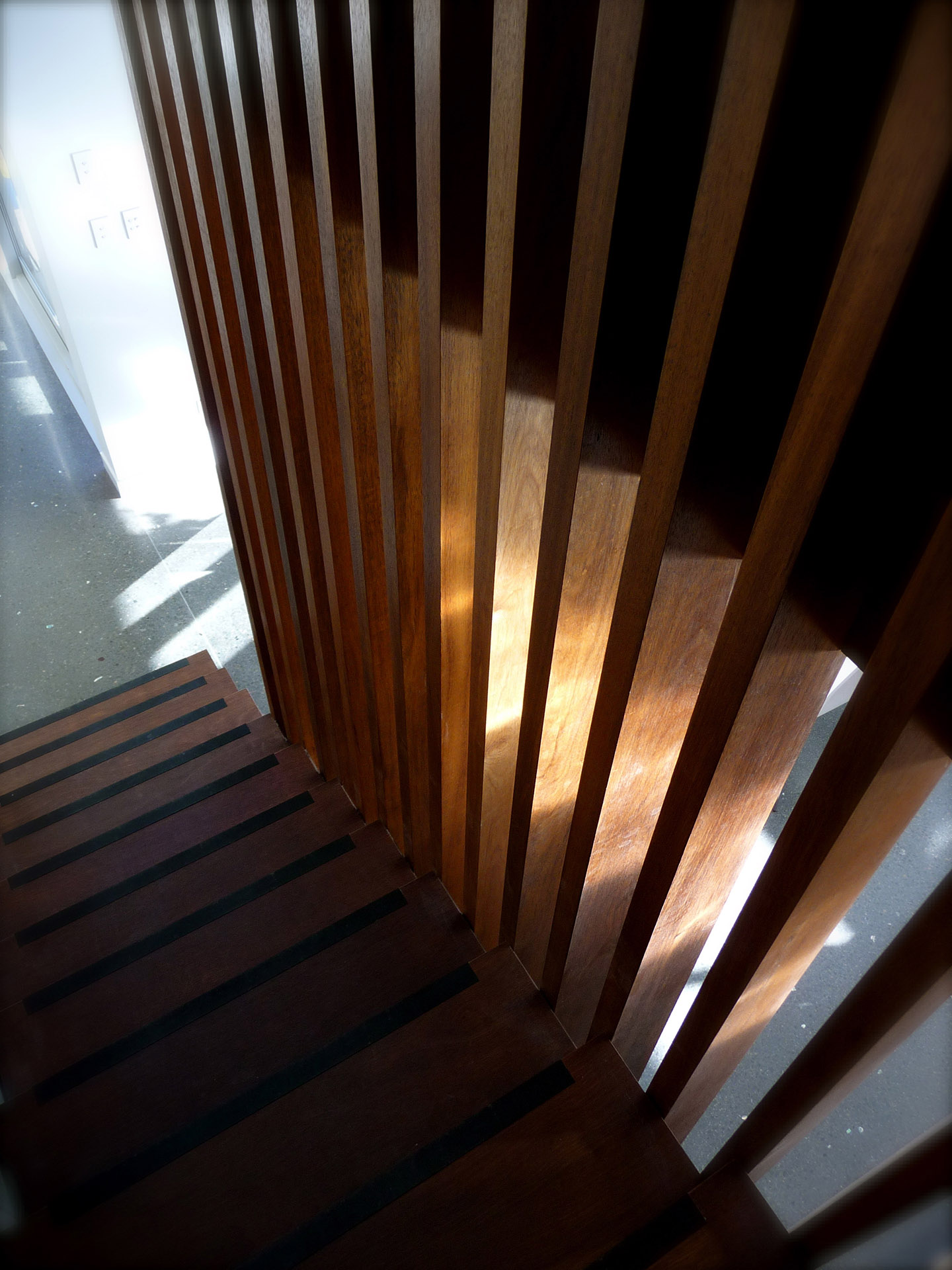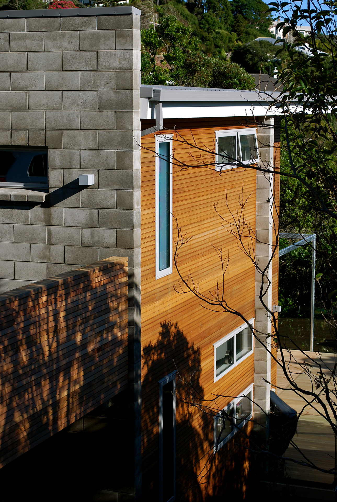The house sits close to the street edge, and parking needed to be provided on site. The house is closed to the street, with a concrete wall and a door facing onto the car-pad. As you cross the threshold and descend you are aware of how private the house is despite its proximity to the road. The added benefit of the mass is the reduction in noise to the interior.