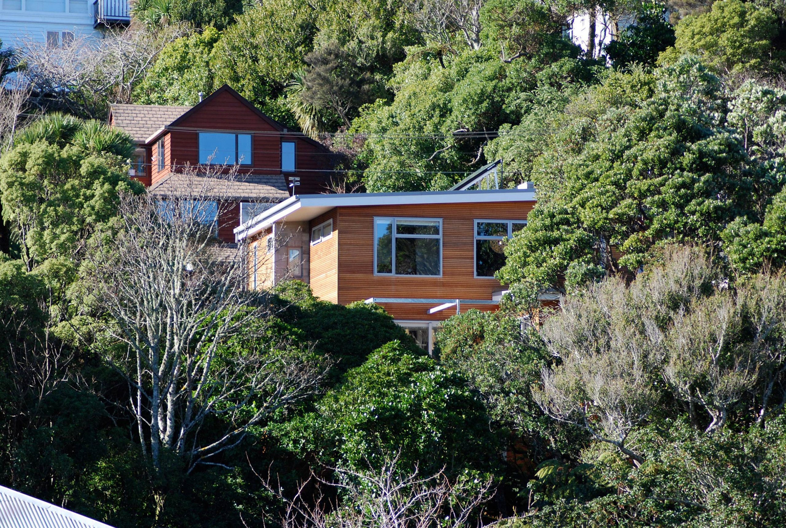 It is hard to establish where this house starts and the site stops. The section drawing reveals this – the steep hill site has been carved and moulded to provide the house volume, and the edges of the volumes have been cast in concrete. The house hugs the hillside, and opens up as you travel down the slope. The carving of the site allows the main living level to have the largest footprint, and also to enjoy all day sun, while being surrounded by the tree canopy.