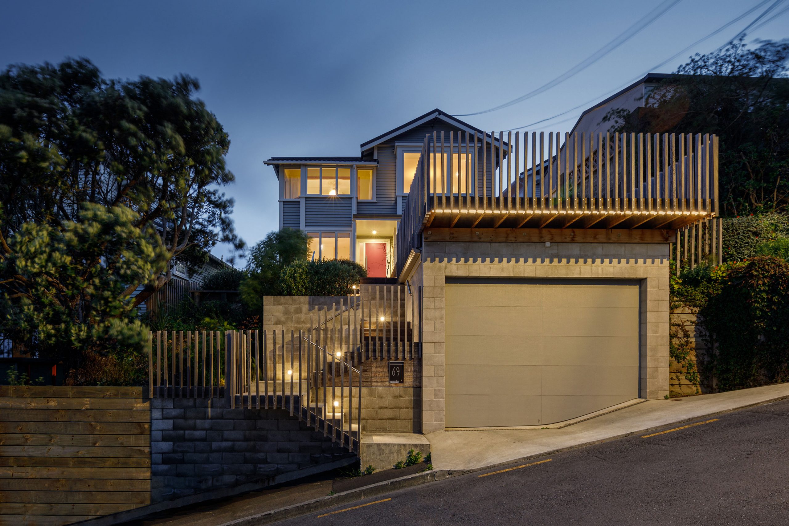 Significant engineering was required to form a garage with an irregular garage door, shaped to accommodate the steepness of the street, and the tricky transition into the site.