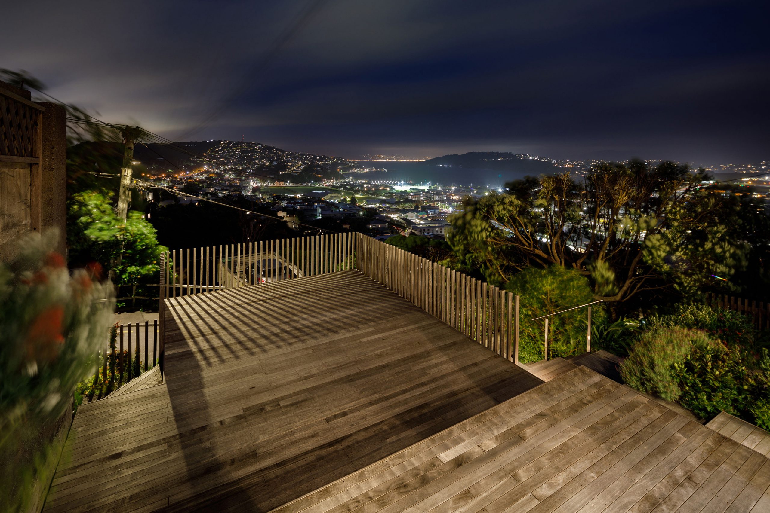 The top of this garage was clothed in a new hardwood deck, hovering above the street below.