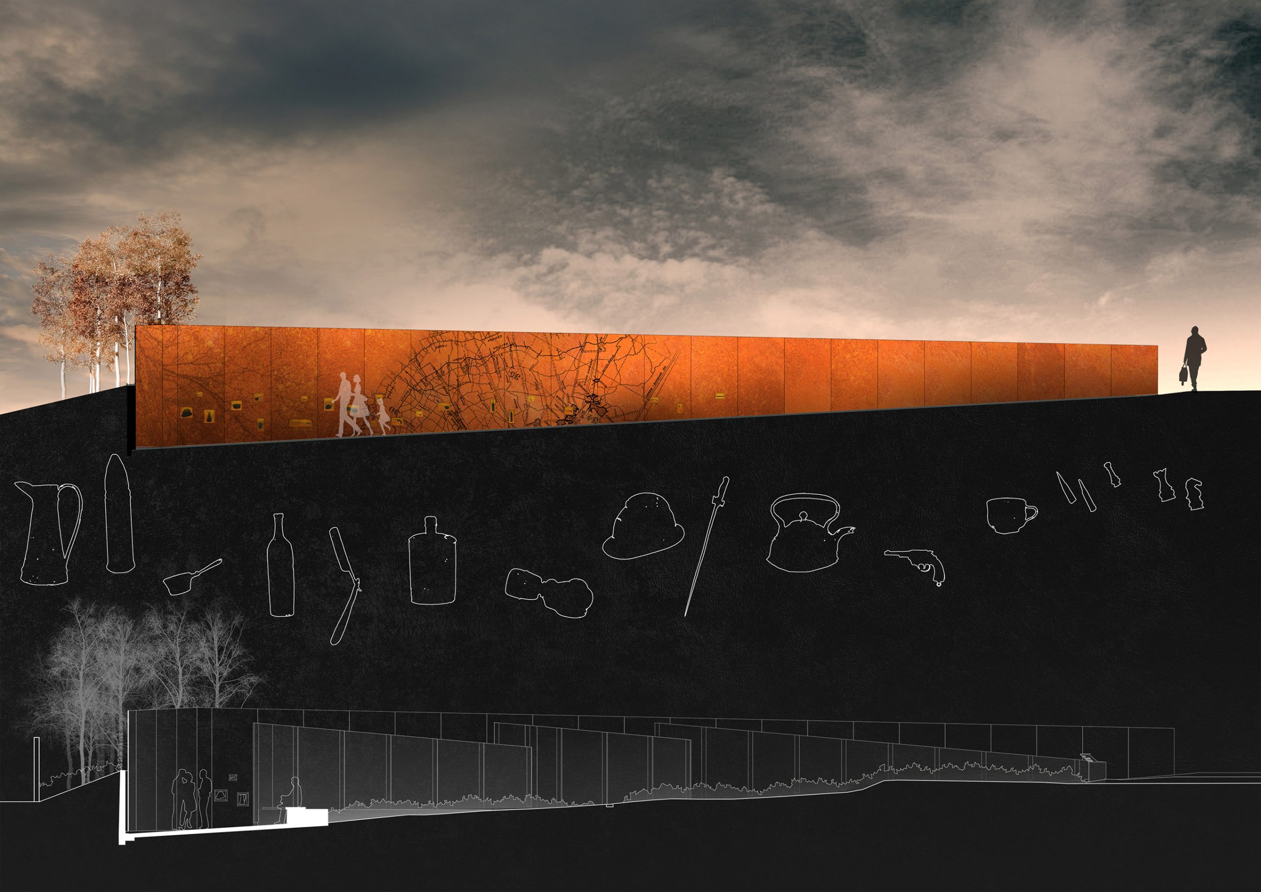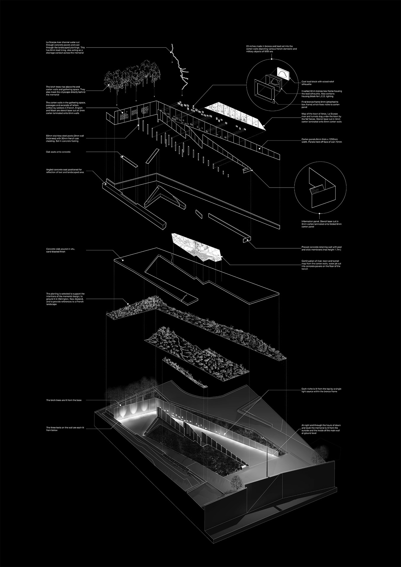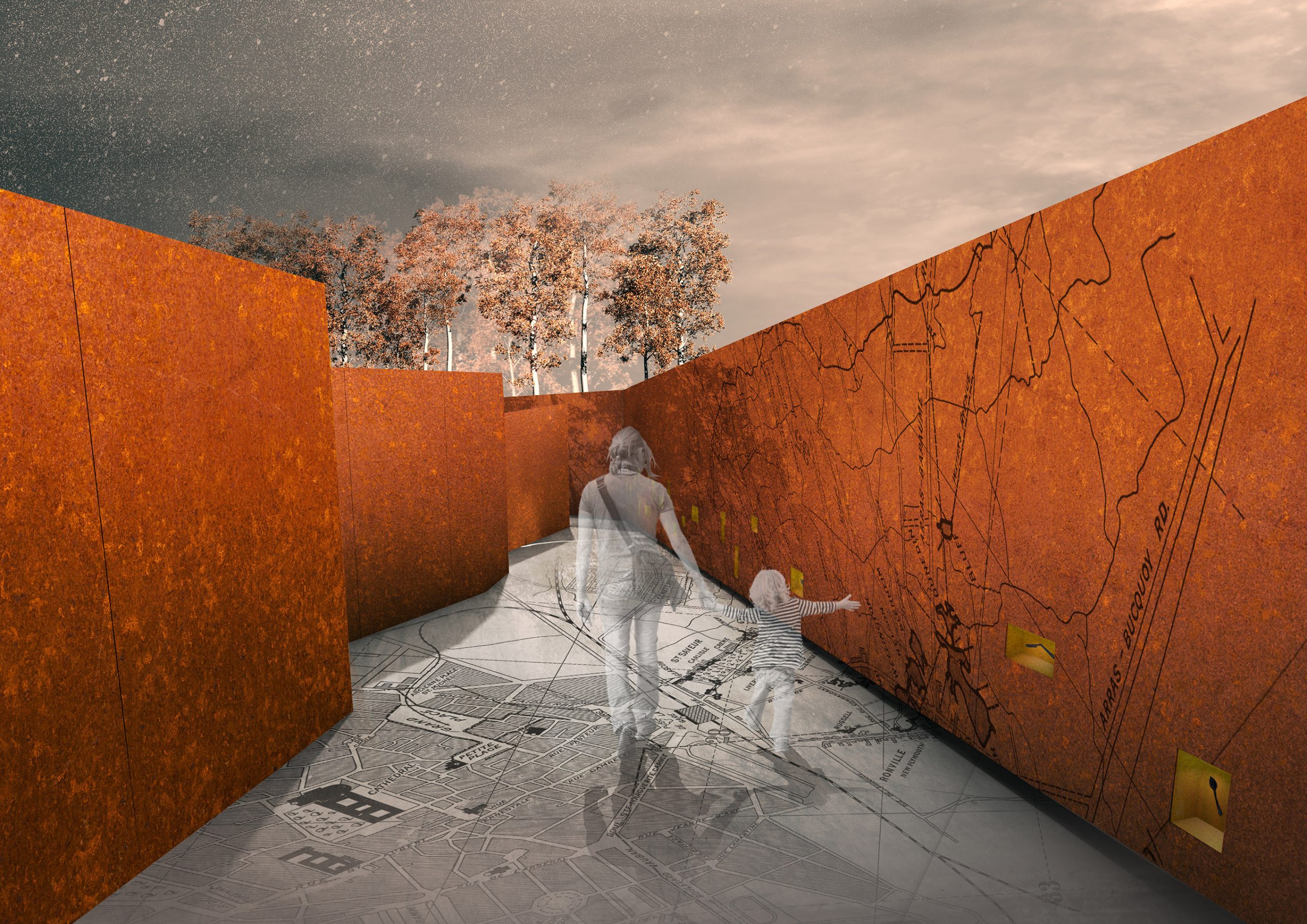 A group of bouleau (birch) trees hover above, disturbing the horizon as they stand as sentries, together – narrow and upright. Like soldiers, they gain strength in numbers, each one relying upon those beside them. A map of the French town of Arras is cut into the walls and floor of the trench, with filigree lines of battle sites, underground tunnels and the town on its surface. La Scarpe River exits the map and slices through the architecture, spilling over the trench into the landscape.