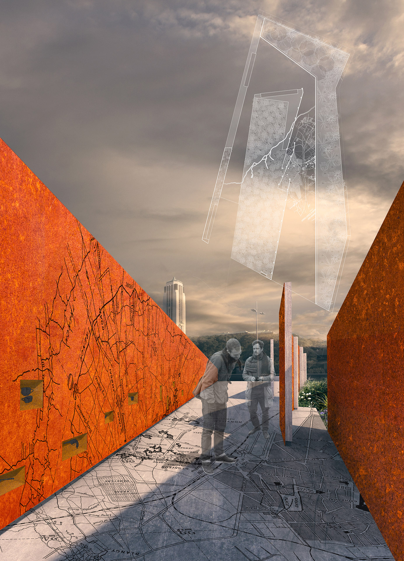As the visitor enters the memorial, the space narrows, the trench wall becomes ever more dominant and the markings and inlays place the site firmly in France. The path down into the trench invites contemplation of the descent into war. The interior of the trench is rich with mapping cut into the concrete floor and corten walls. The trench surrounds the visitor, and the city beyond disappears from view. The experience is sensual, rather than intellectual, relying on perception and memory.