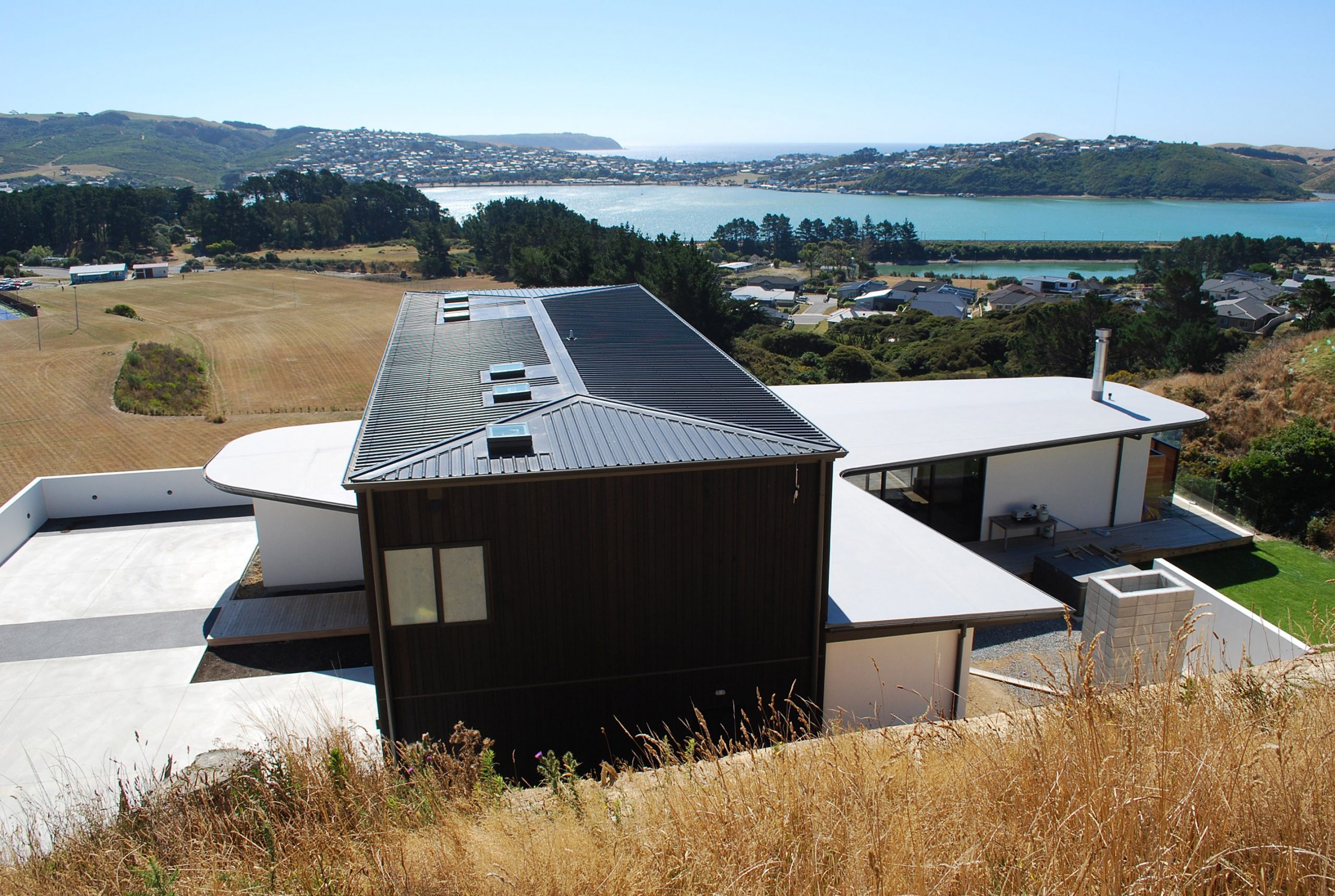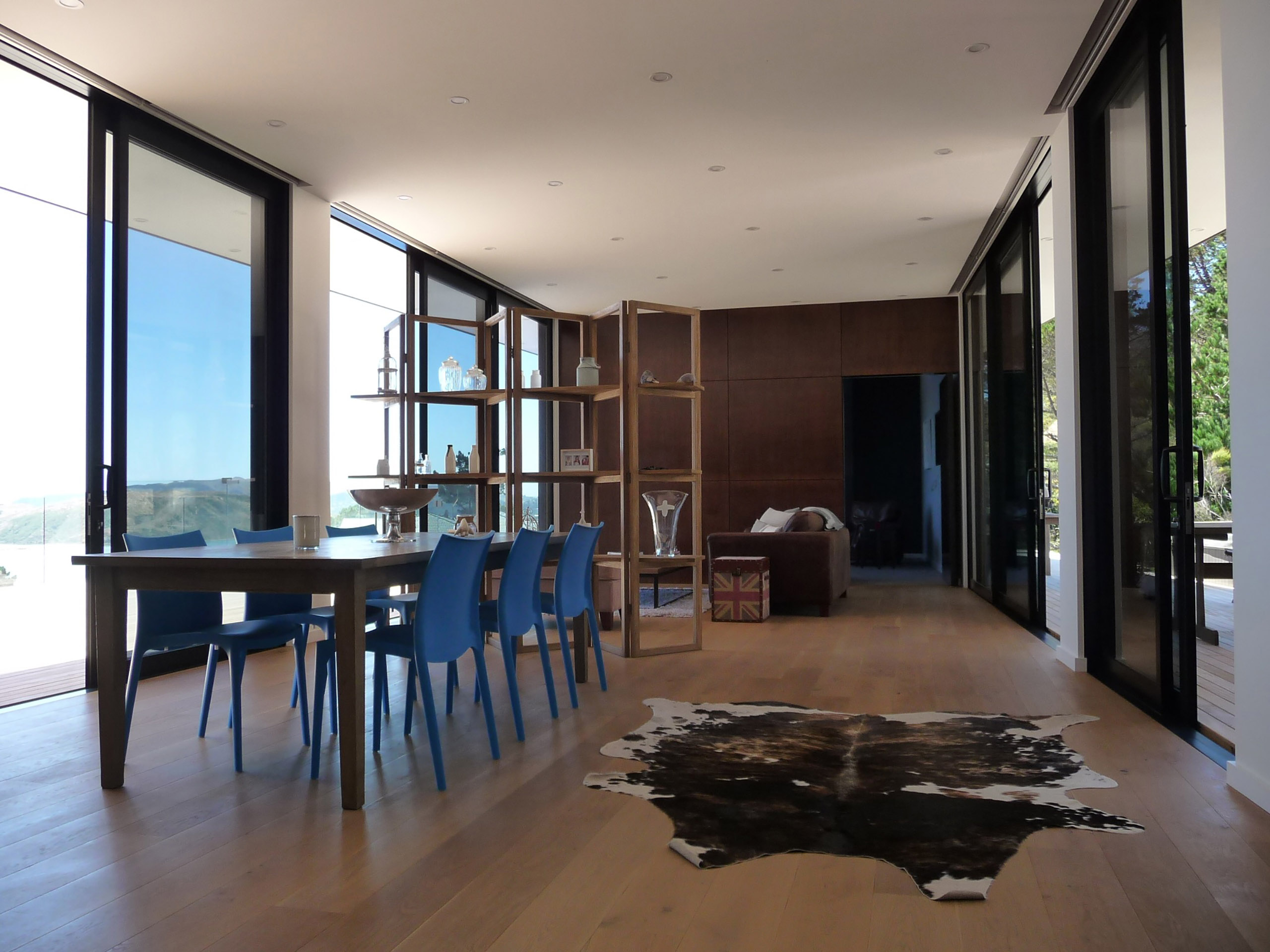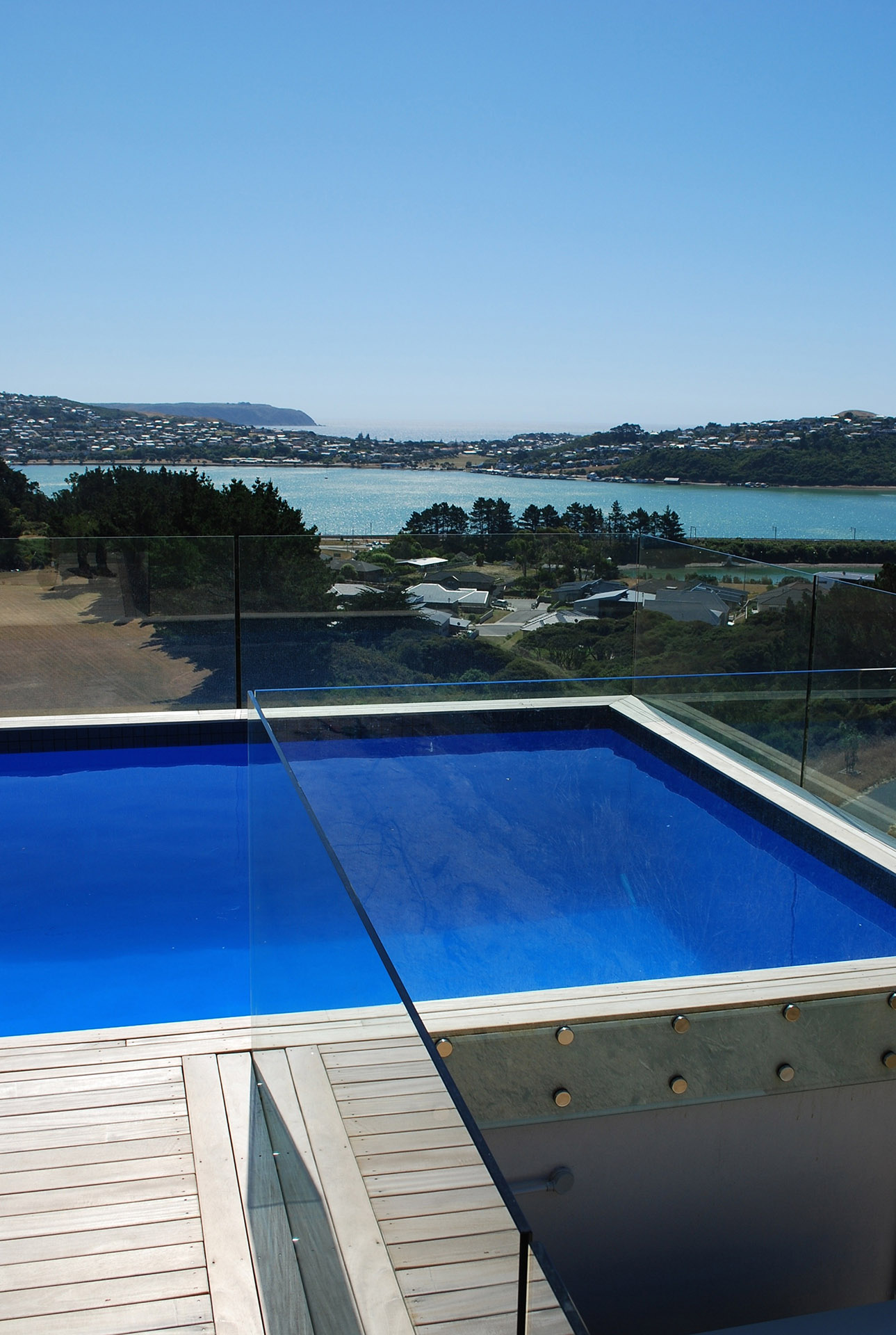 Visibility through the house to the water was a design requirement with a young family using the pool. The transparency of the house provided reassurance and oversight. With the exposed site came the prospect of overheating, as well as the glare of the sun, and therefore deep eaves protect the interior space, and darker rooms are created for evening retreat space and movie watching.