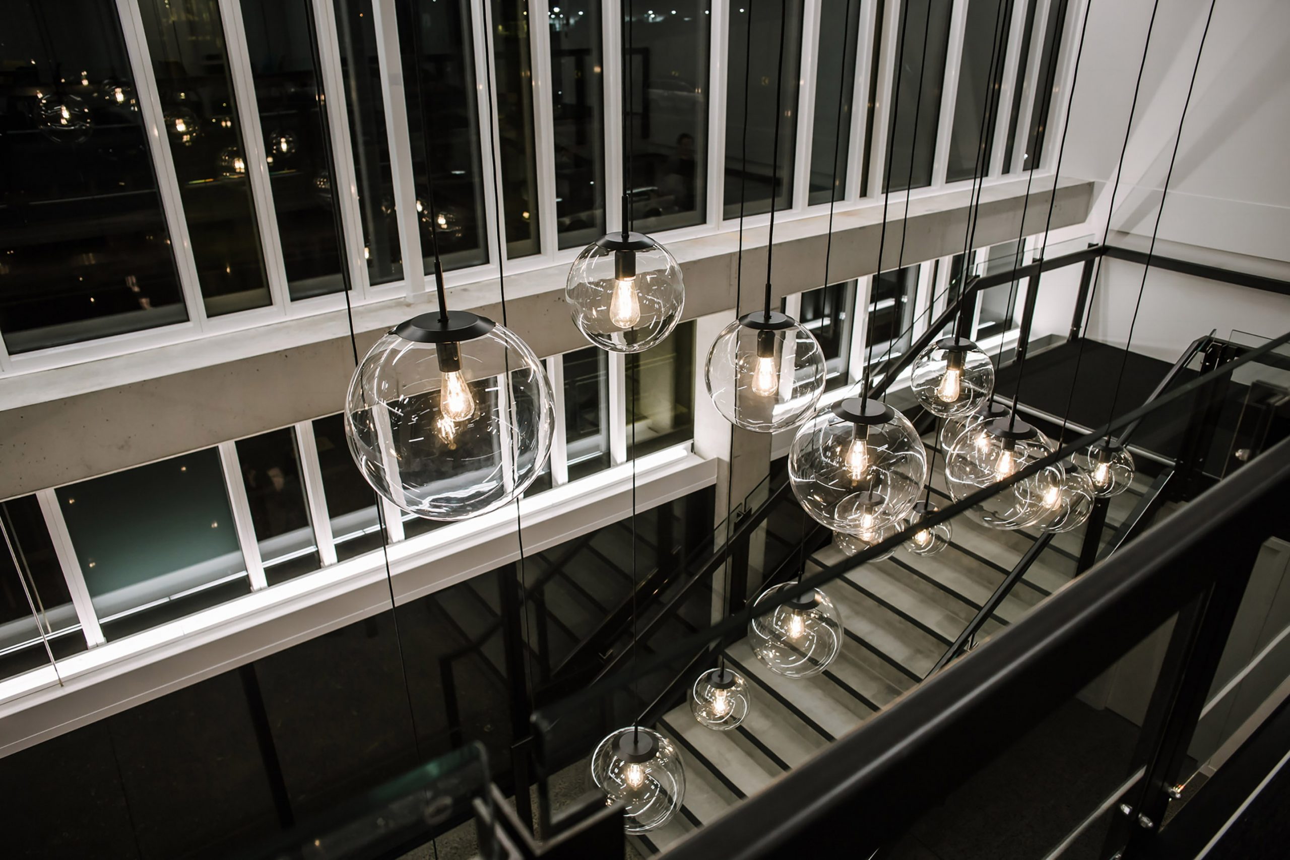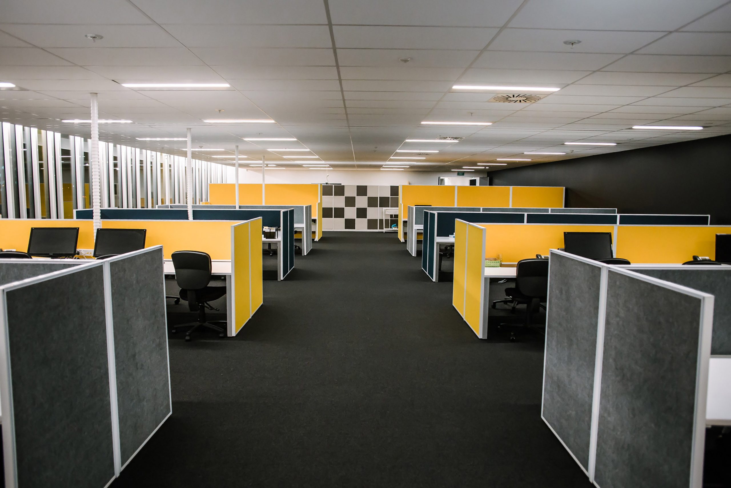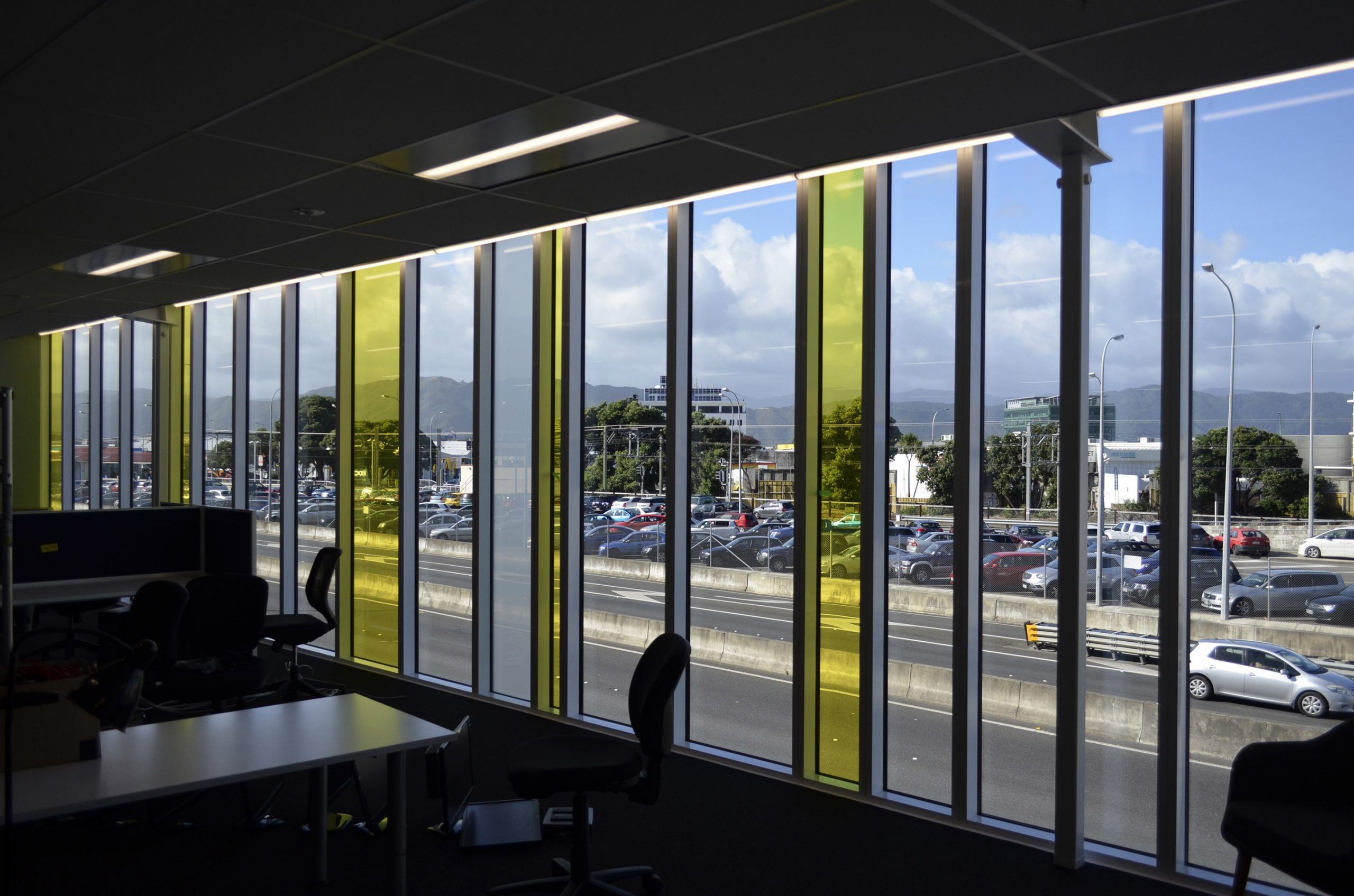 Inside the spaces are gently coloured by the yellow glazing, and this colour has been taken through the interior, reappearing in doors, and further integrating the facade with the space within. The colour itself bridges the office zone and its movement through the spaces provides a tangible link to the outside. Only the auditorium remains untouched as a black box sheltered behind.
