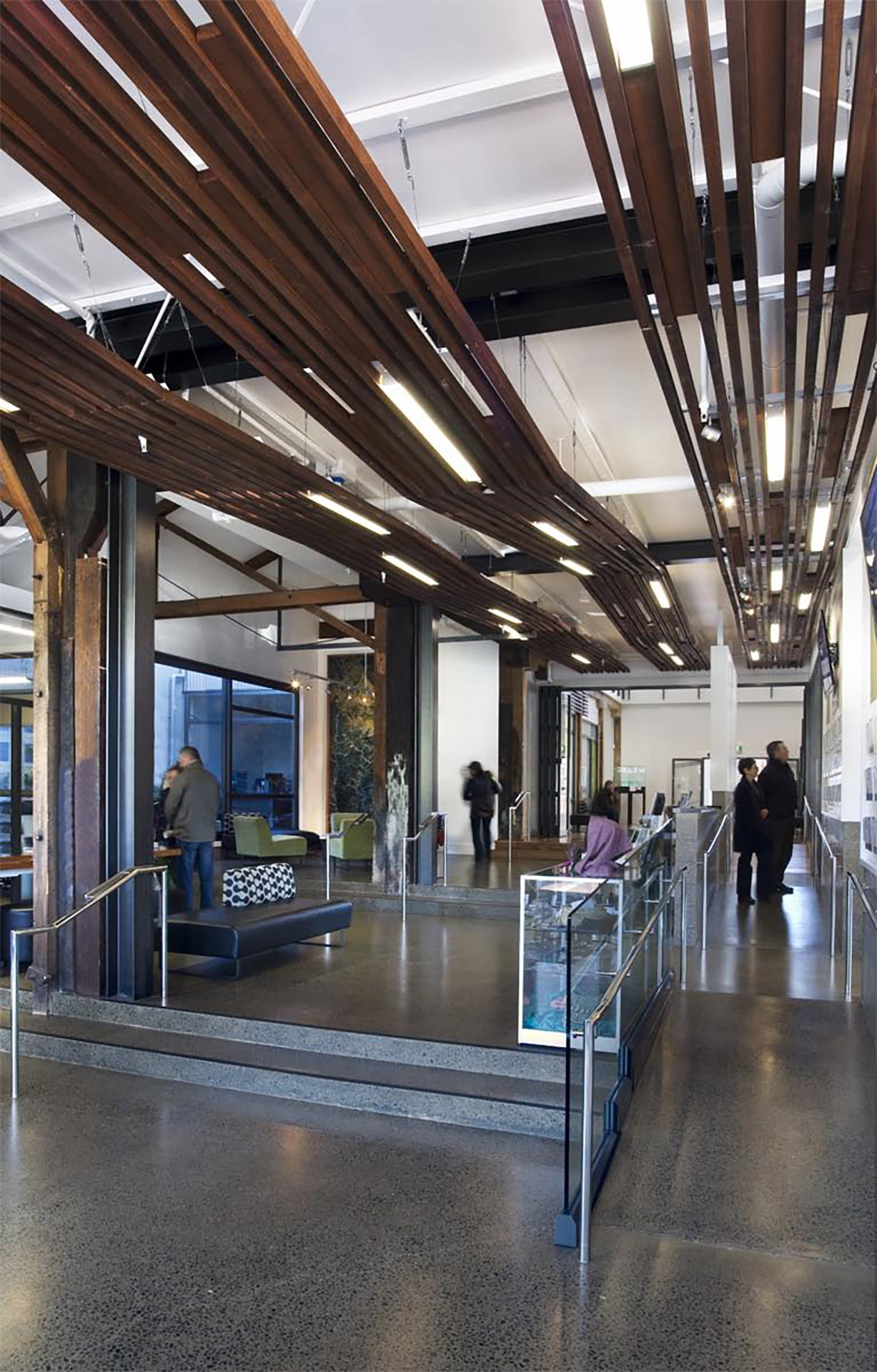 An atrium void was formed through the centre front of the building to visually link, and provide access between the upper and lower levels, while the joists that came out of the light wells are reused as part of the long reception desks. The river’s edge side of the building was opened up to the river views with new extensive glazing. Adaptive reuse of an existing building is an important environmentally sustainable model for building in Whanganui. Even though this building has been refitted, re-clad and brought up to current codes, it is still regenerating existing building patterns.